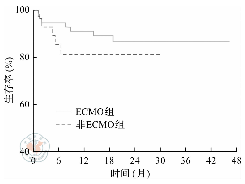 Methods The clinical data of 96 recipients who underwent heart transplantation in the Department of Cardiovascular Surgery, the First Affiliated Hospital, College of Medicine, Zhejiang University from March 1st, 2019 to August 31, 2022 were retrospectively analyzed. All 96 recipients were divided into the ECMO group (n=33) and the non-ECMO group (n=63) based on whether received ECMO as circulatory support. To compare continuous variables between groups, the unpaired Student′s t-test was used if the continuous data were normally distributed, while the Mann-Whitney U test was used when the continuous data were non-normally distributed. Chi-square test was used to compare categorical variables. Kaplan-Meier survival analysis was performed to make survival curves and were compared by using log-rank test. P<0.05 was considered statistically significant.